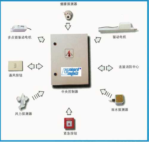 系统组成:主控1幢楼或1个层面,分控1个消防分区或1个楼层,点控1-4樘窗;多个主控用工控组成亿太网与楼宇系统相连,1个主控与多个分控,多个点控组成控制网络;
